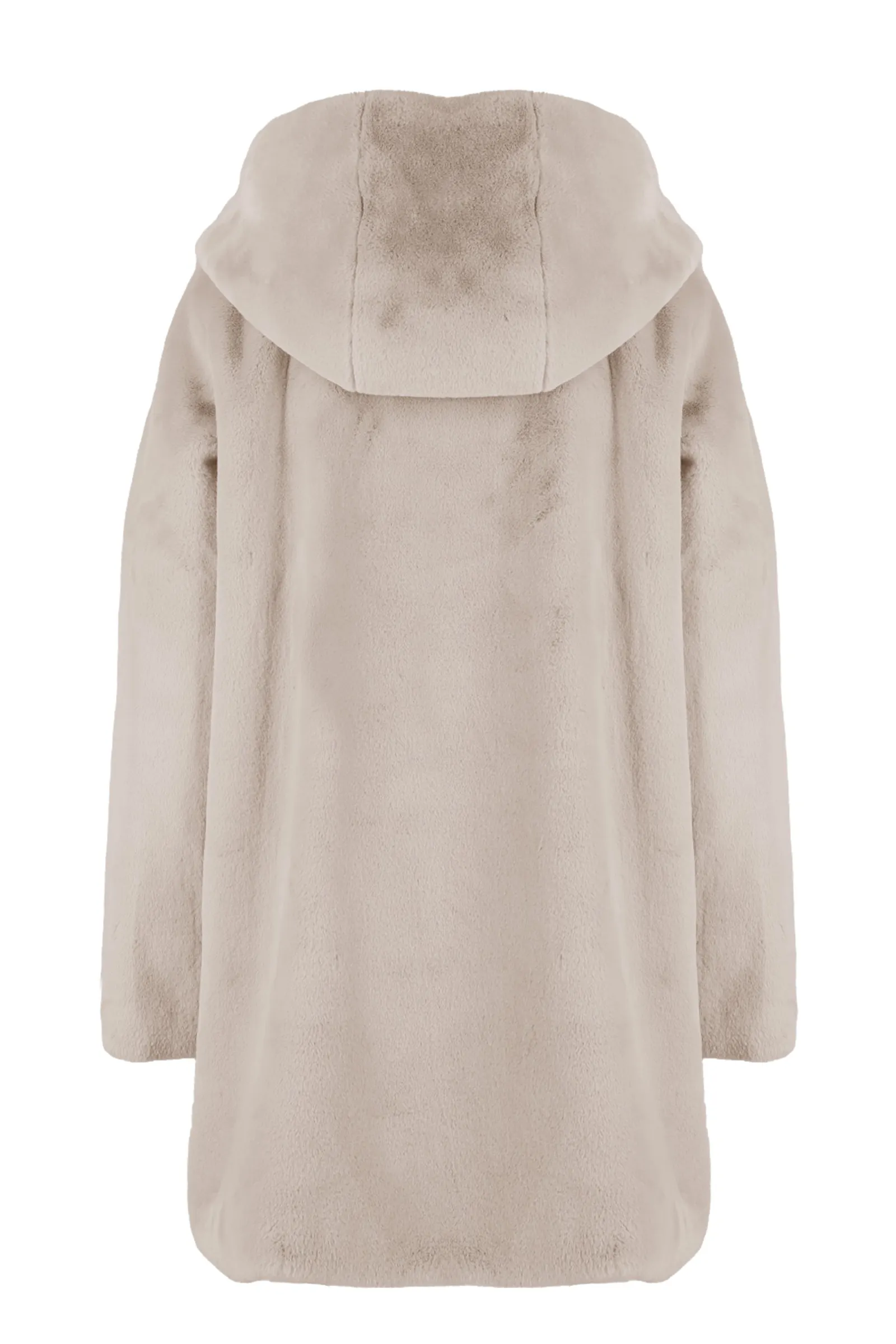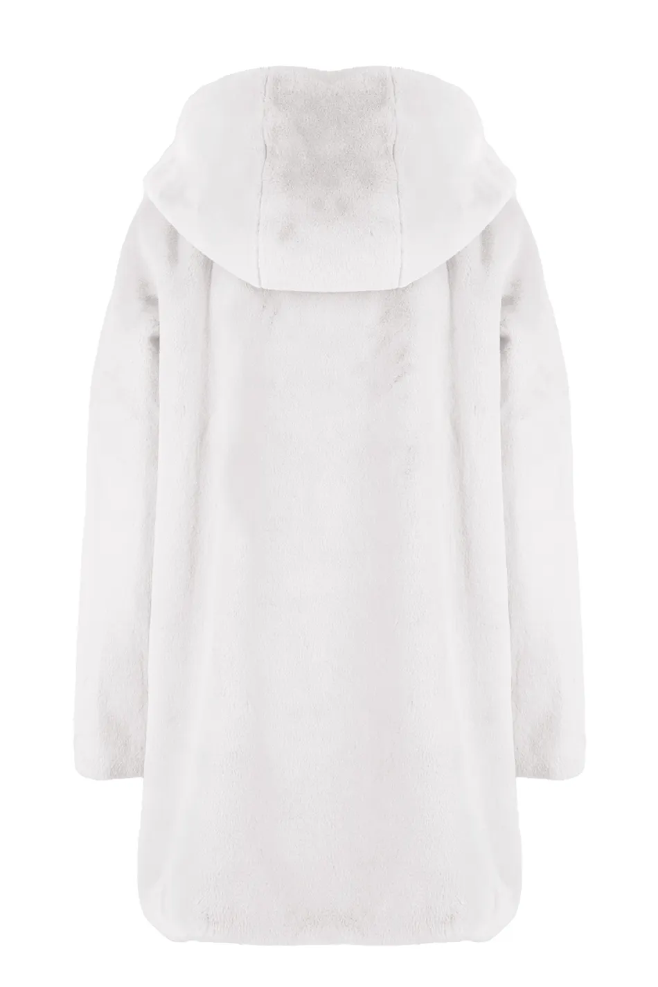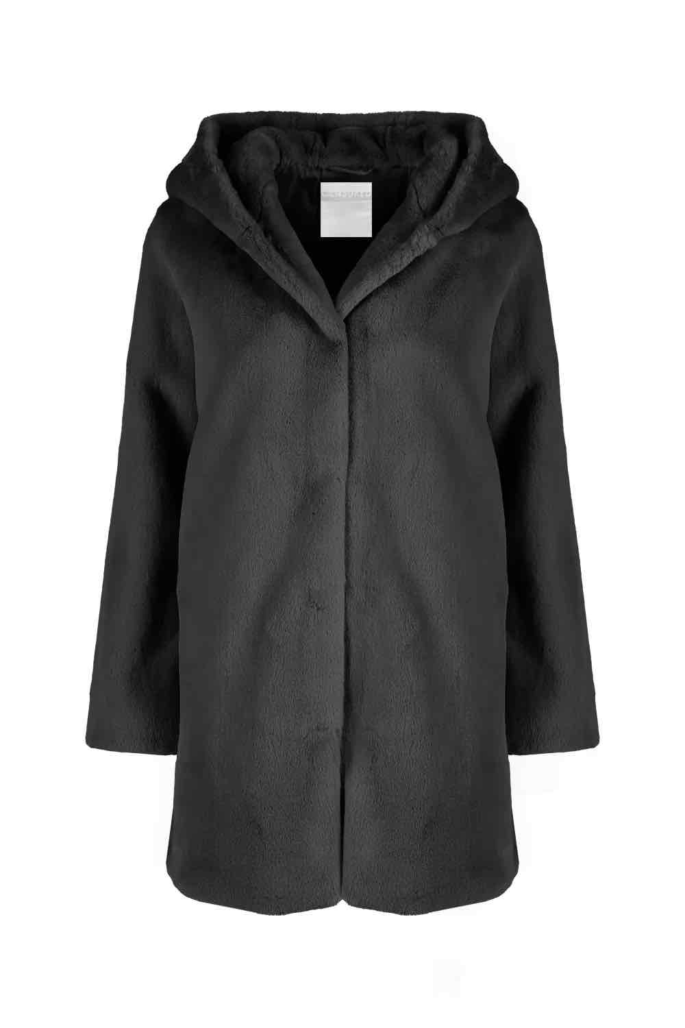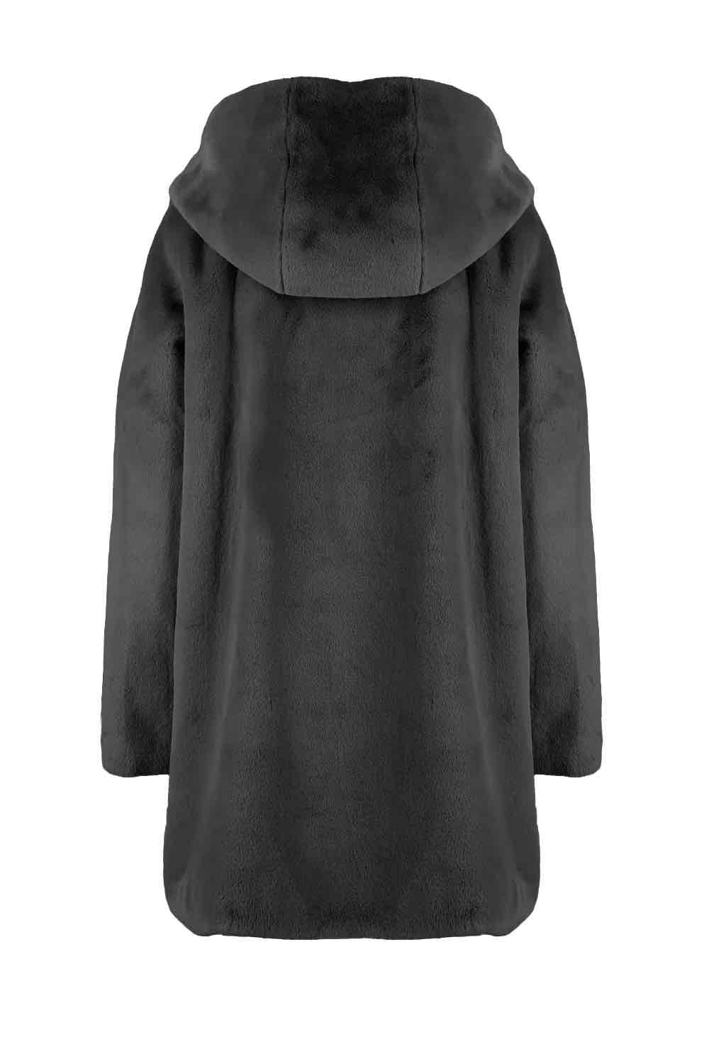 Morbido cappotto in ecopelliccia dalla linea moderna con cappuccio. Caldo e soffice, perfetto per chi ama il comfort senza riunciare allo stile.