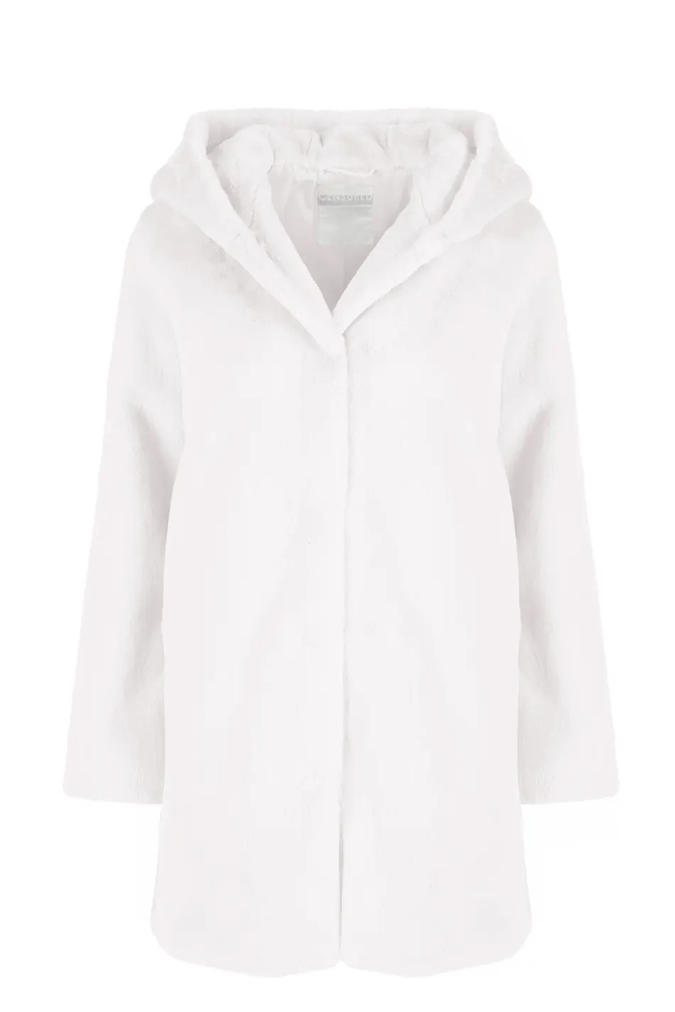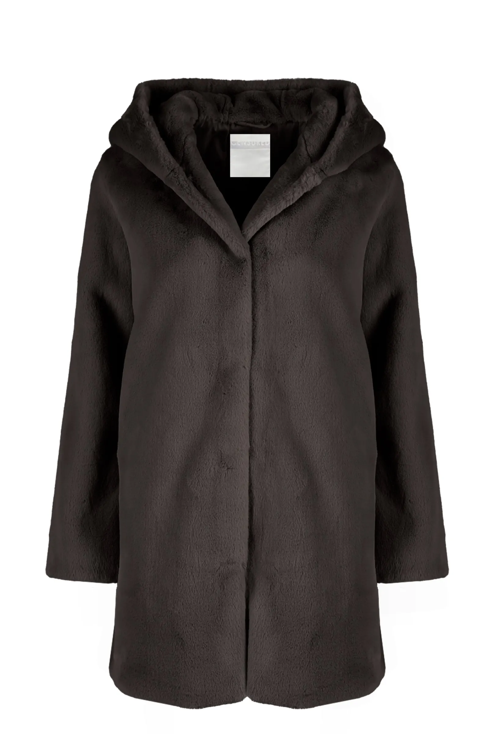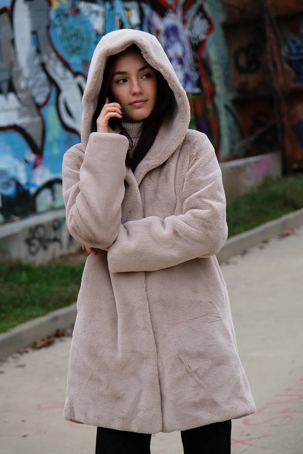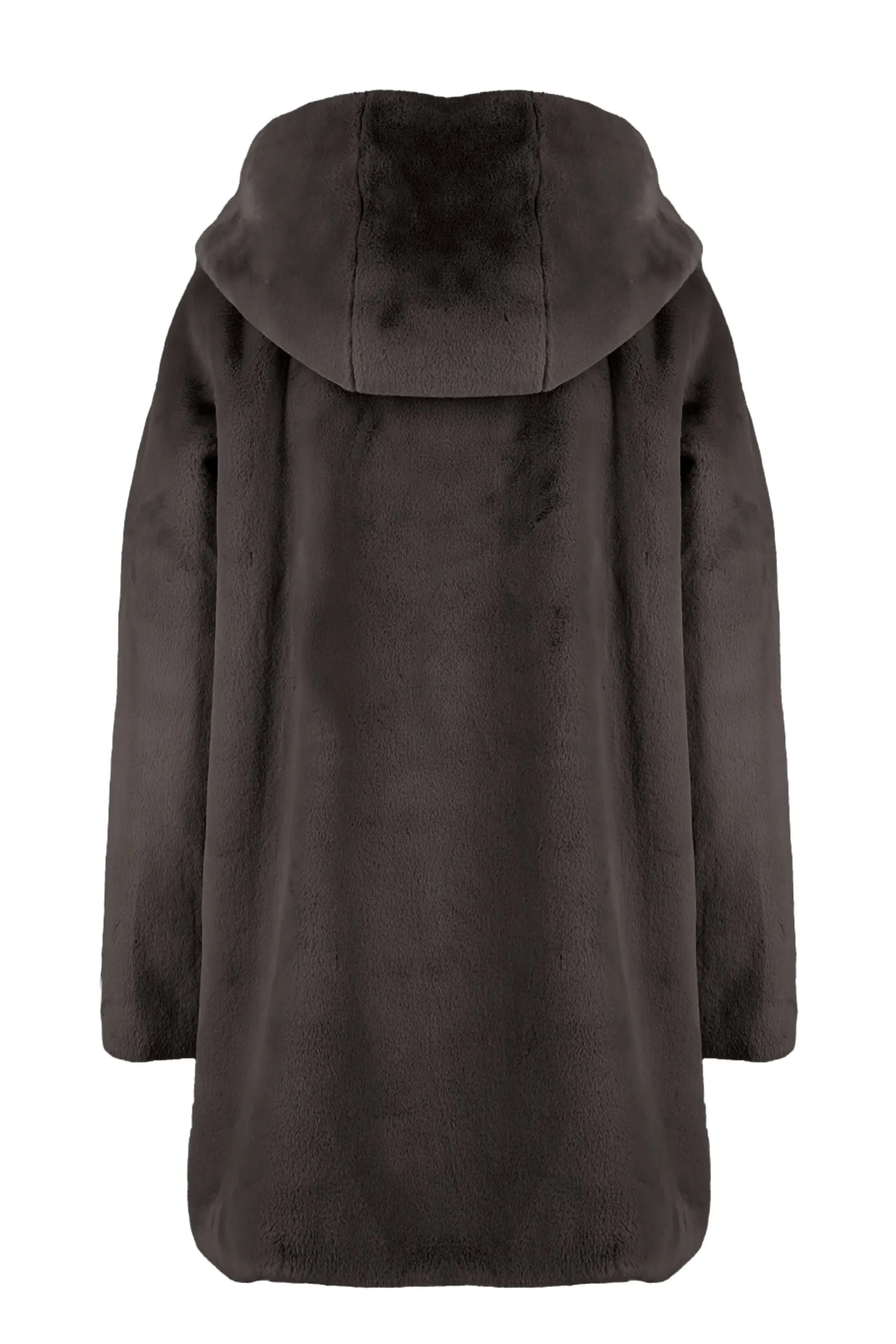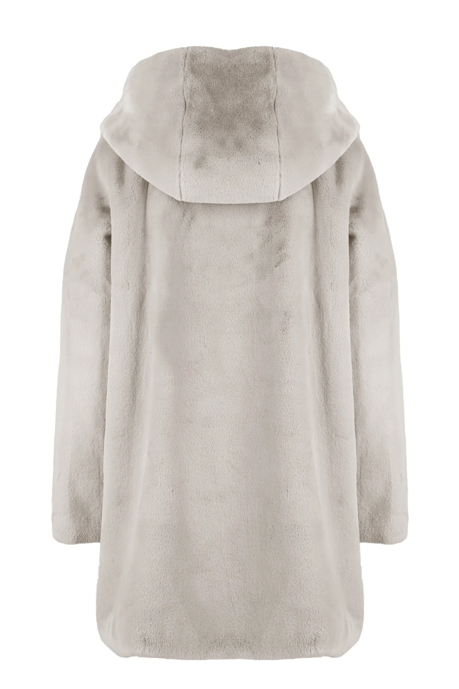 Morbido cappotto in ecopelliccia dalla linea moderna con cappuccio. Caldo e soffice, perfetto per chi ama il comfort senza riunciare allo stile.