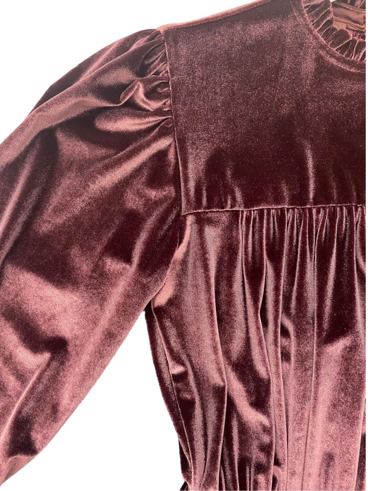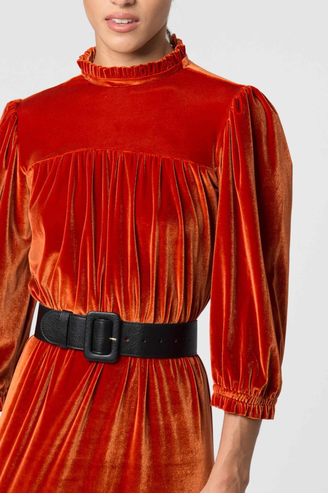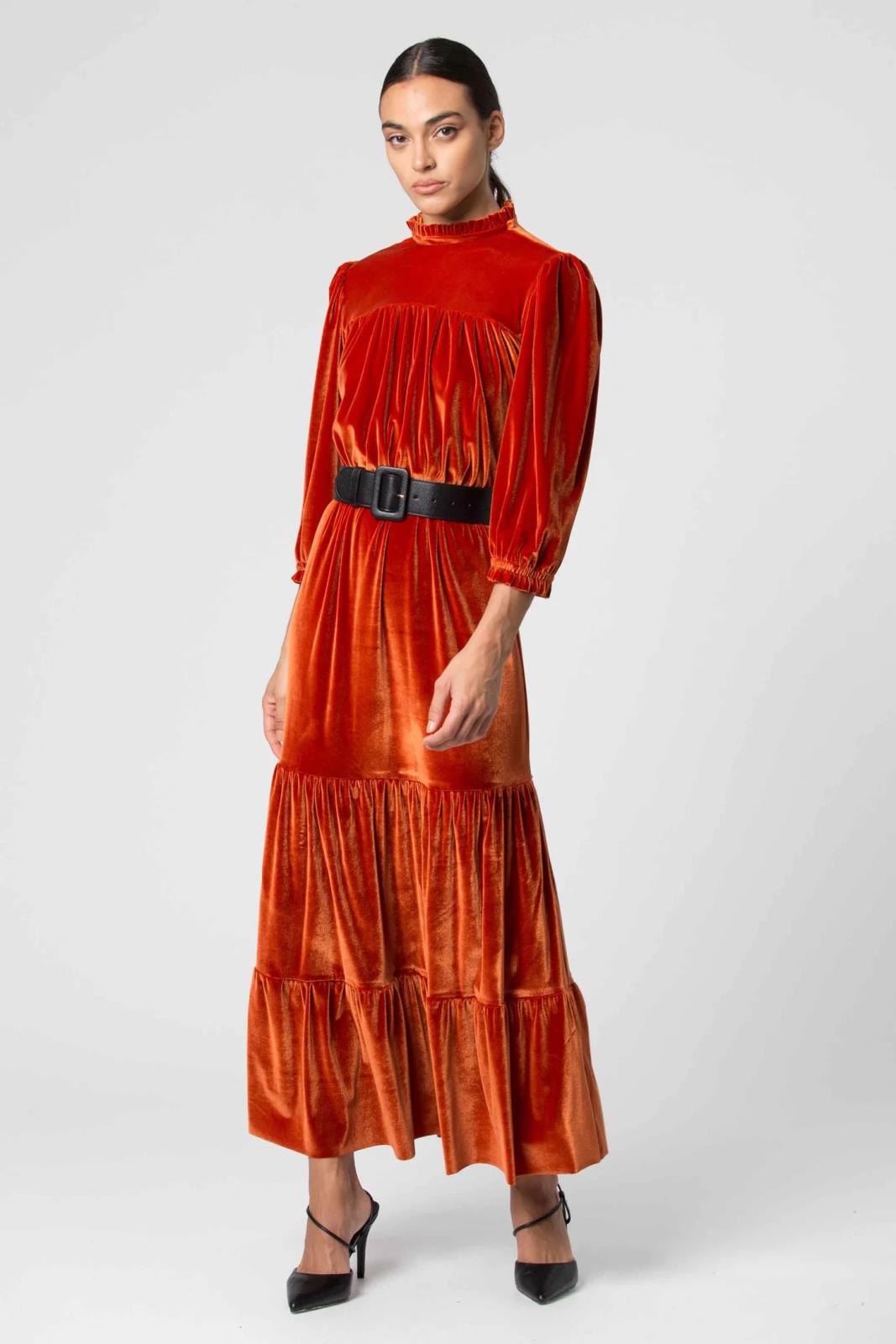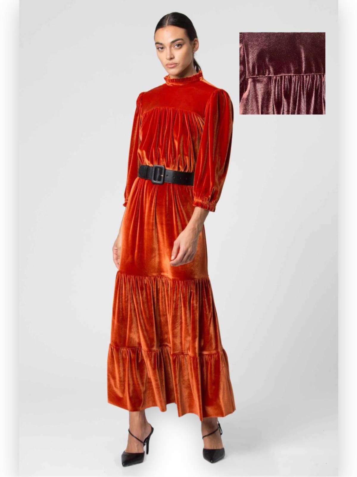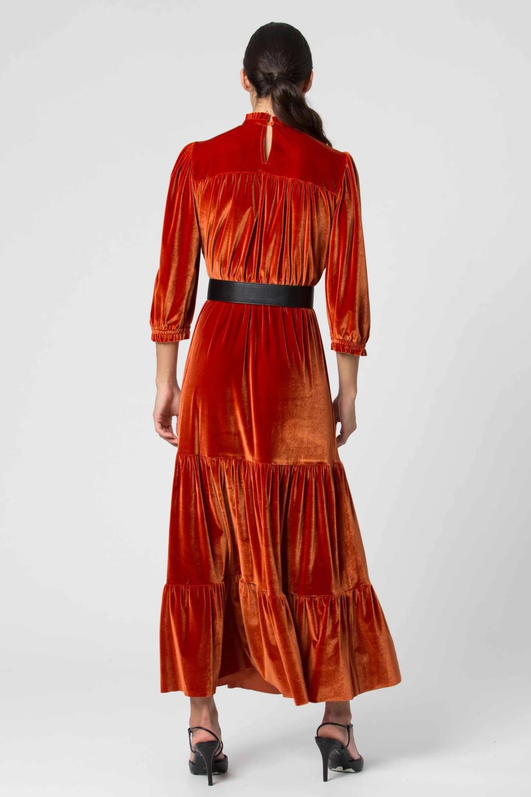 Abito lungo da donna in ciniglia con balze e colletto arricciato. L'abito è corredato da una cintura per valorizzare al meglio il punto vita. Questo abito può essere abbinato con un cappotto elegante e un paio di scarpe con tacco.