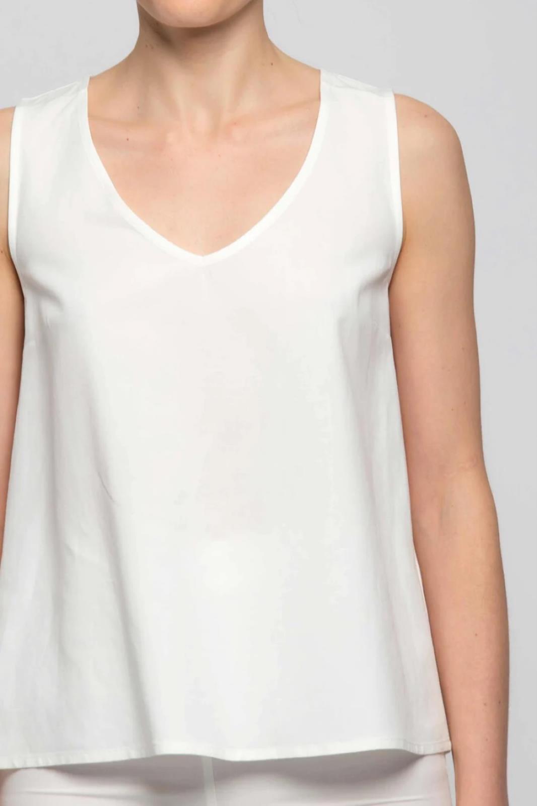 Top smanicato, in viscosa e lino, appartenente alla Capsule Better Natural, con spalline larghe e ampio scollo a V. Perfetto come sottogiacca, si può anche indossare da solo con pantaloni dalla vestibilità aderente, sandali alti e accessori color oro.