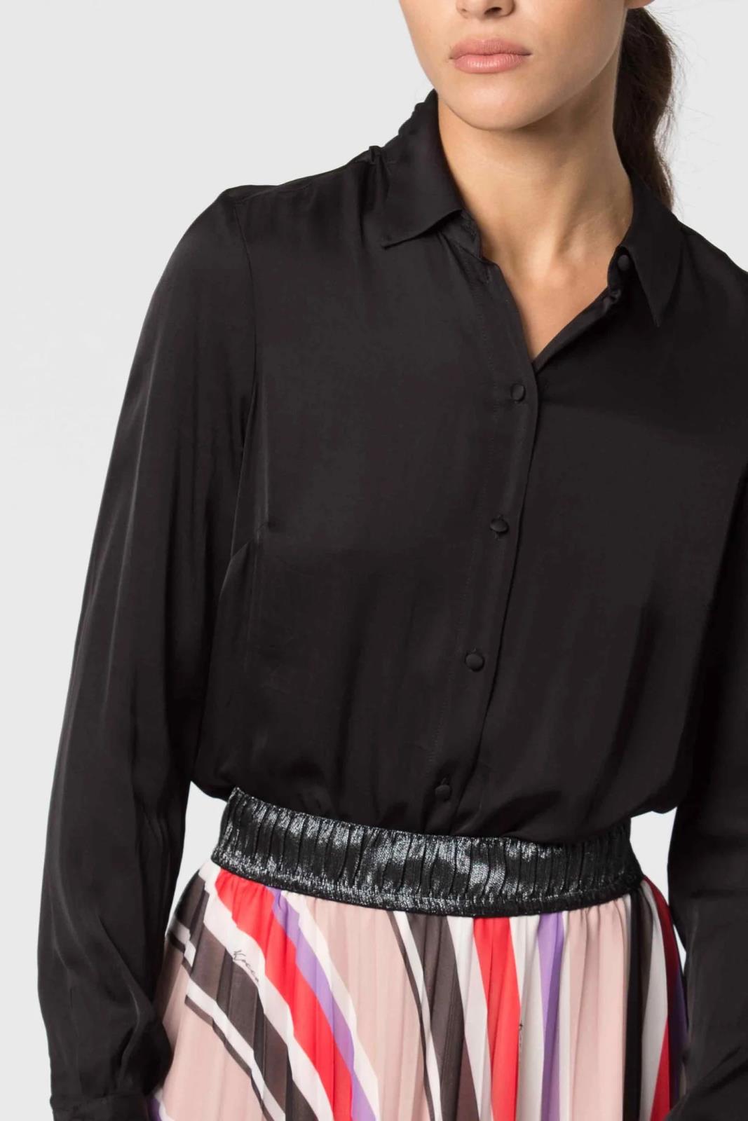 Camicia interamente in viscosa, piacevolmente morbida sulla pelle, con taglio dritto, colletto a punta e bottoni rivestiti anche sui polsini. Perfetta sotto la giacca o il blazer è ideale da abbinare a gonne a campana o aderenti, così come a jeans e sneaker.