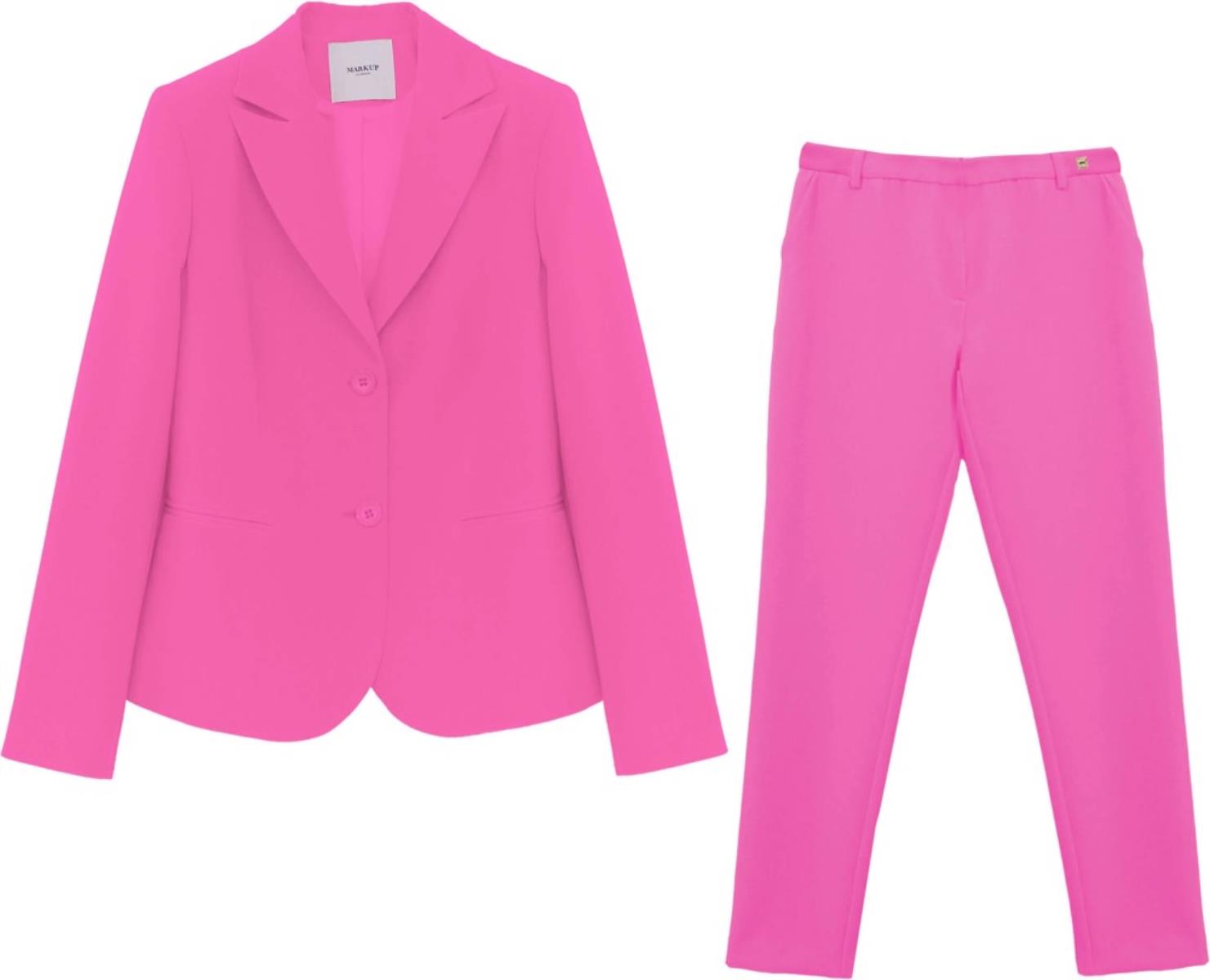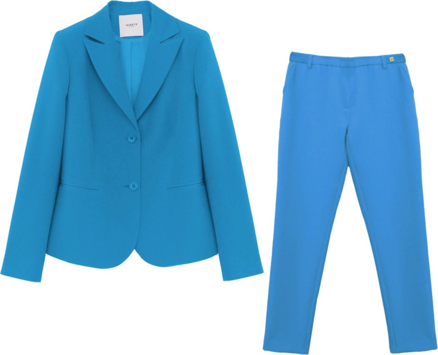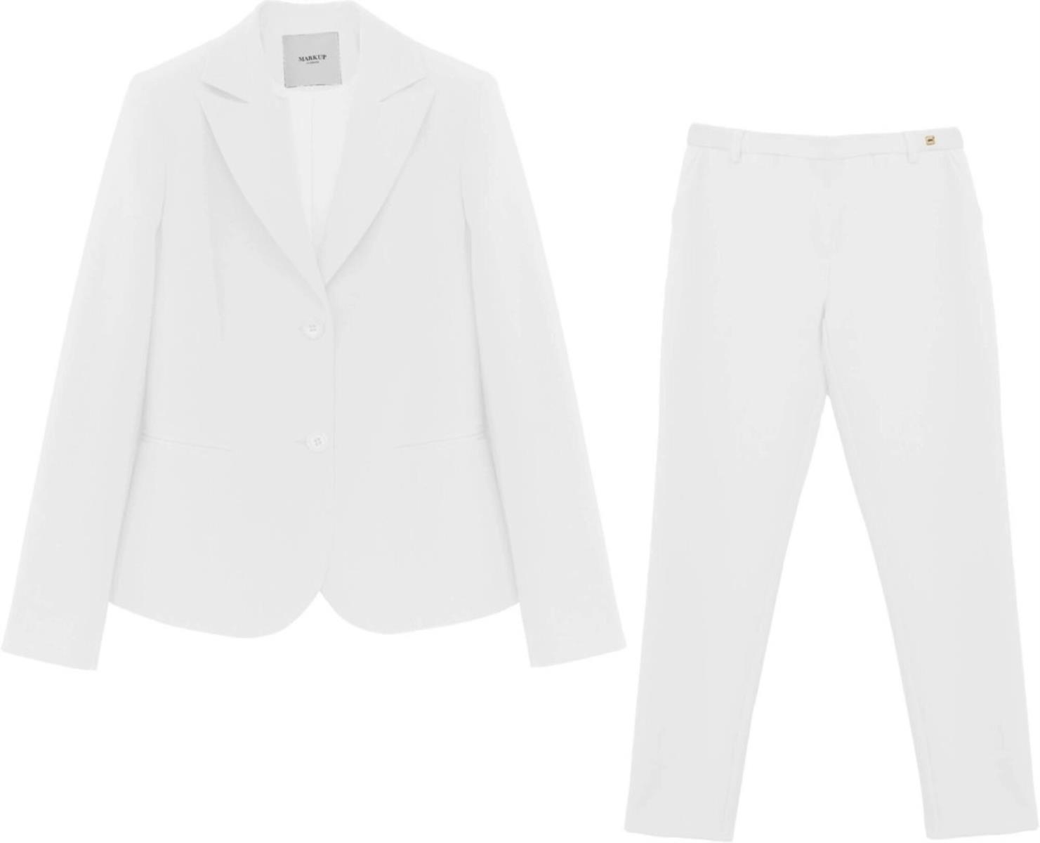 Blazer in tessuto bielastico con rever classico, apertura frontale con bottoni in tinta, tasche frontali a filetto. Pantalone straight in tessuto bielastico, tasche frontali inserite, apertura sul davanti con gancio interno e zip.