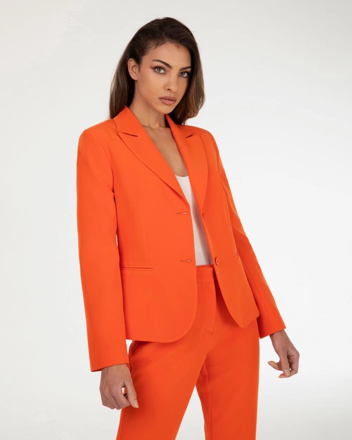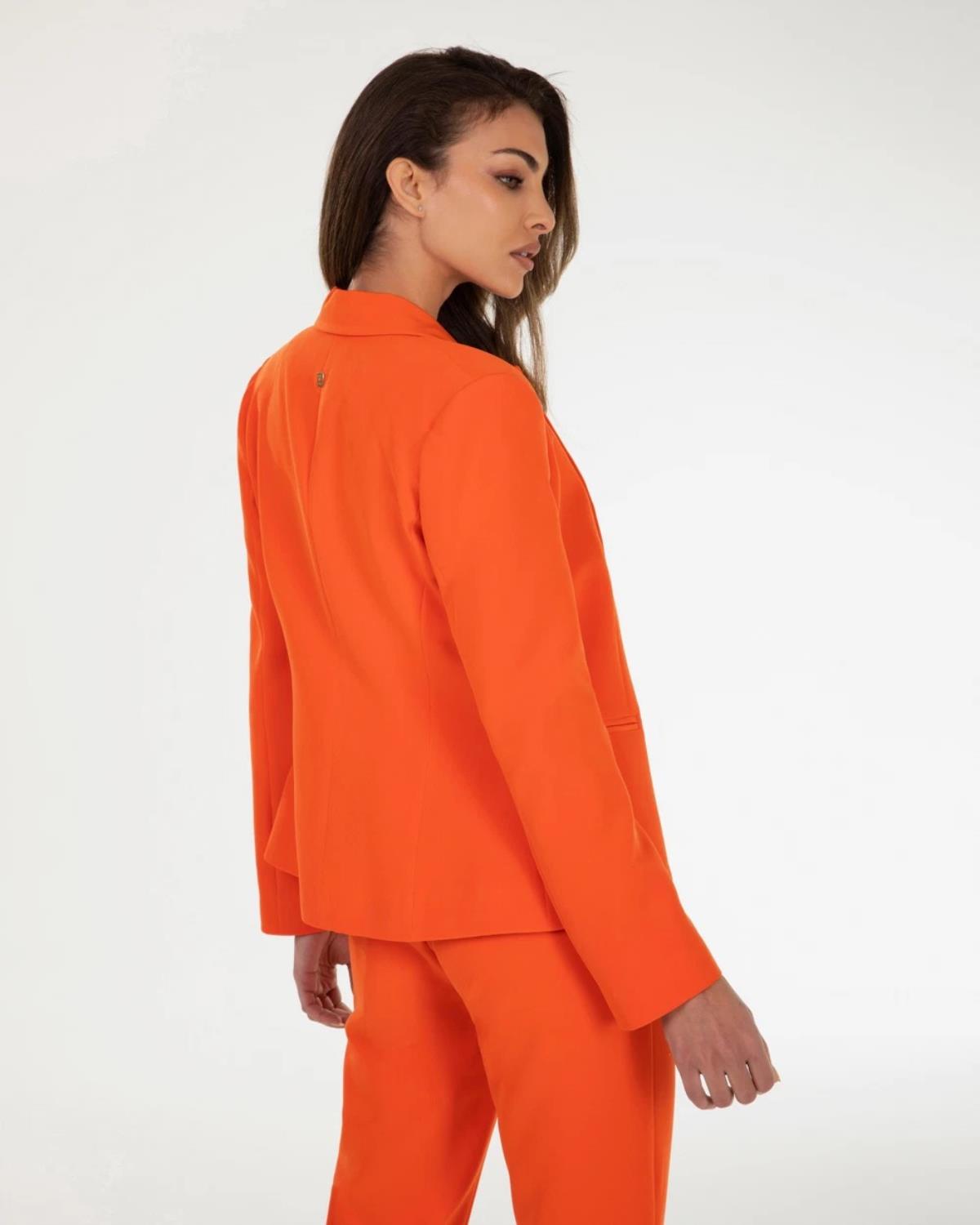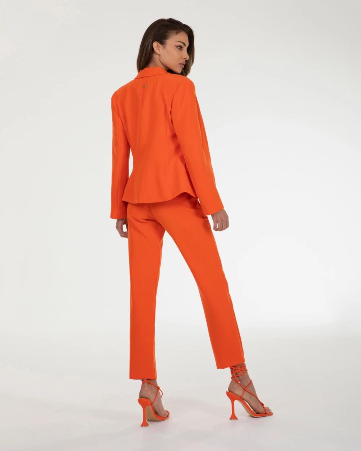 Blazer in tessuto bielastico con rever classico, apertura frontale con bottoni in tinta, tasche frontali a filetto. Pantalone straight in tessuto bielastico, tasche frontali inserite, apertura sul davanti con gancio interno e zip.