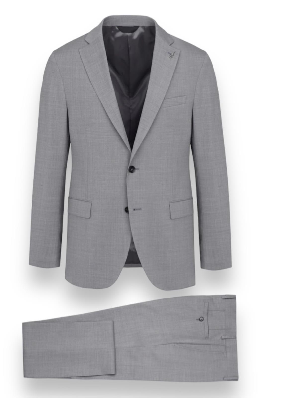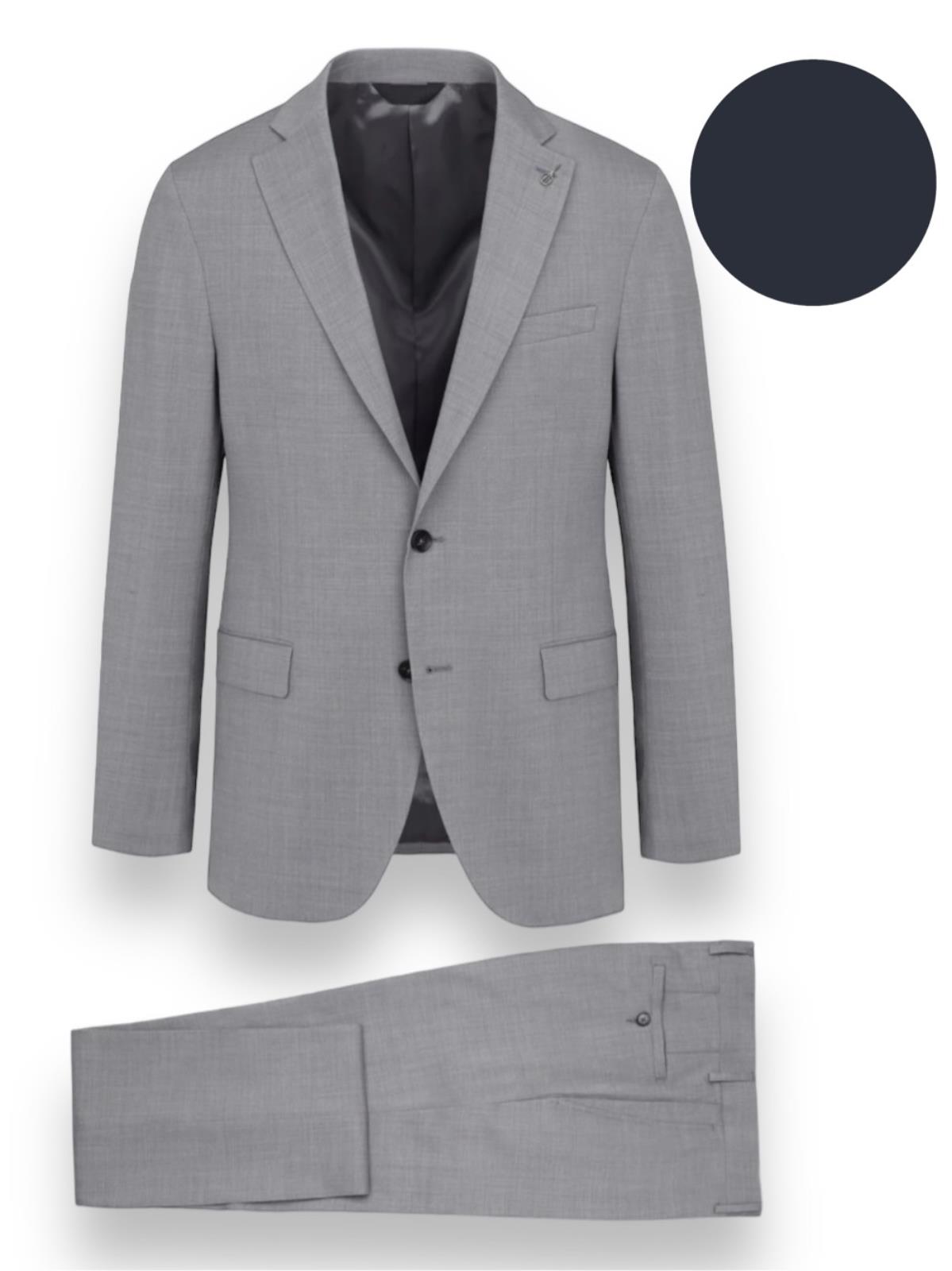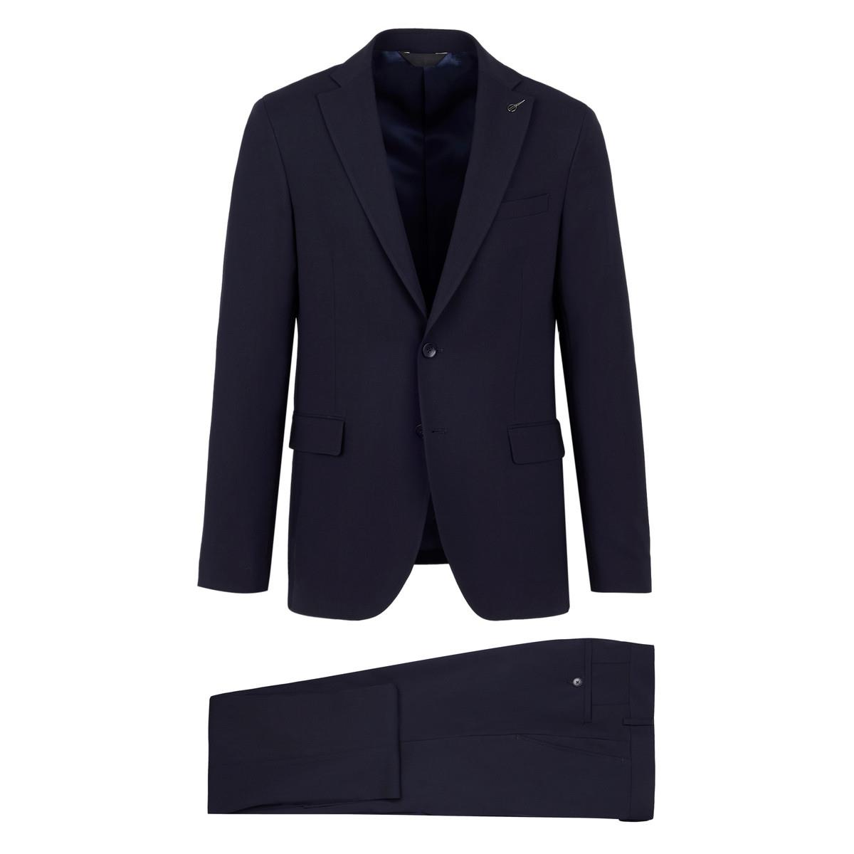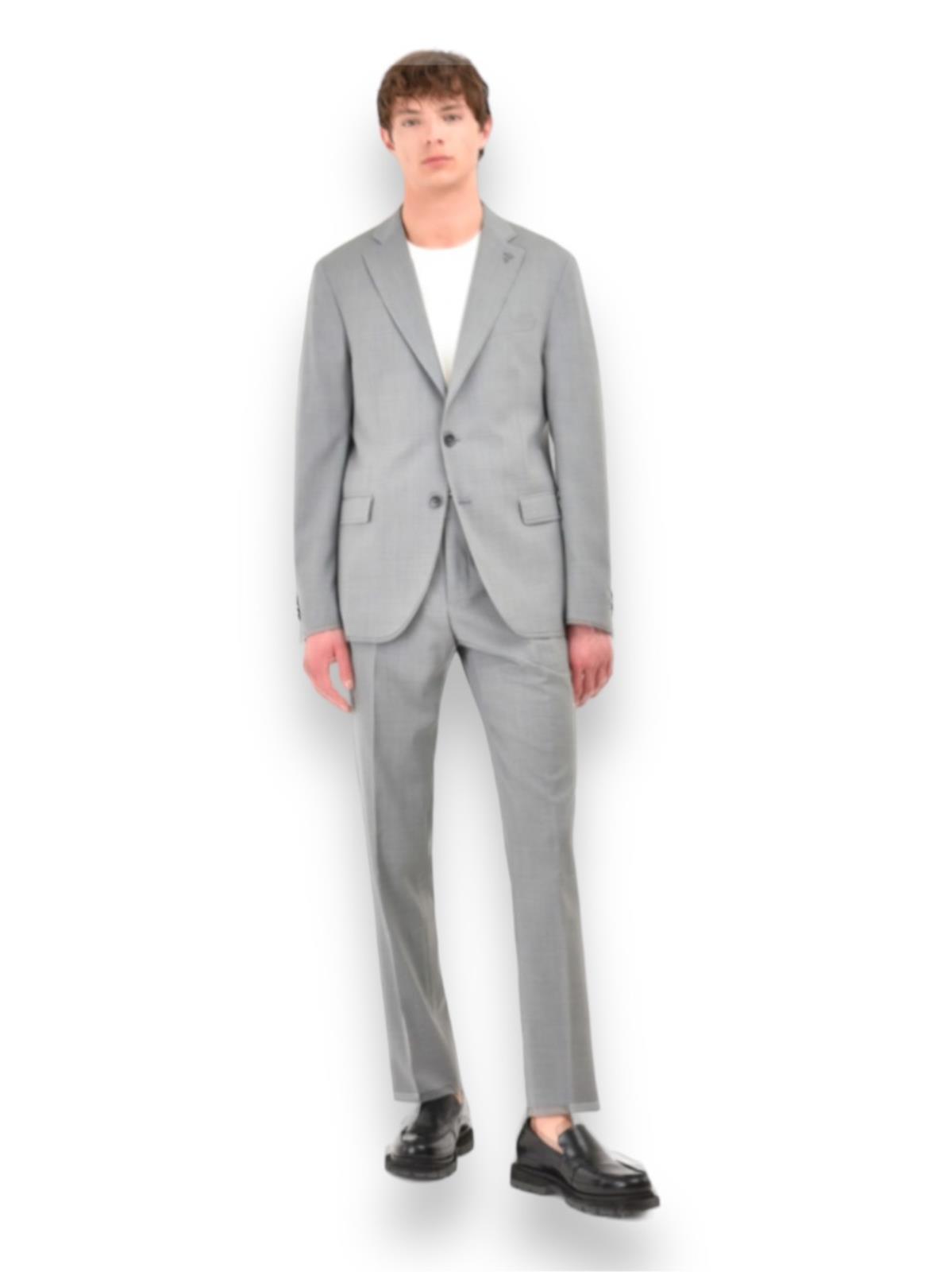 Abito monopetto foderato base "Slim" drop 7. Giacca foderata 2 bottoni, rever cm. 8, tasche con patte, spacchi laterali e taschino a pistagna, quattro bottoni sormontati sul fondo manica. Giacca con rinforzo al petto e spalla "naturale", lunghezza su tg. 50 cm. 73. Pantalone senza pinces, chiusura a zip con gancio e bottone in vita, passanti per cintura, tasche inclinate laterali e ad un filetto posteriori, fondo cm. 18. Tela lana natural stretch B-dynamic