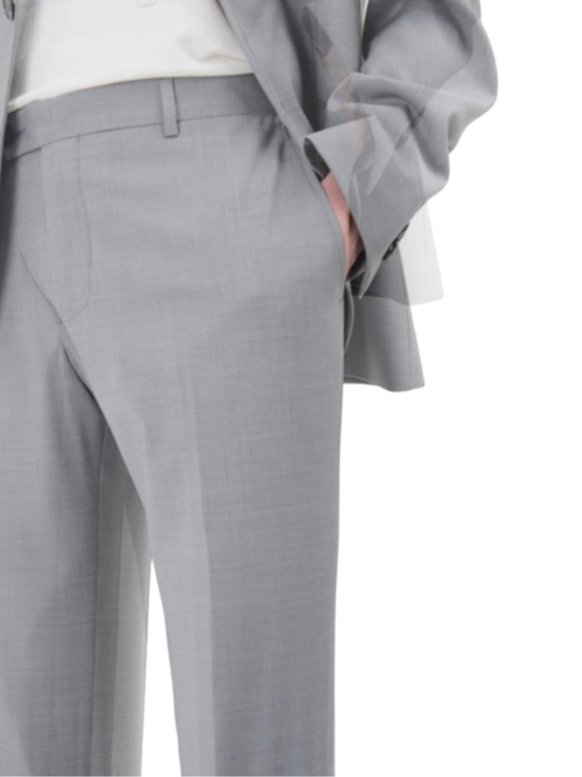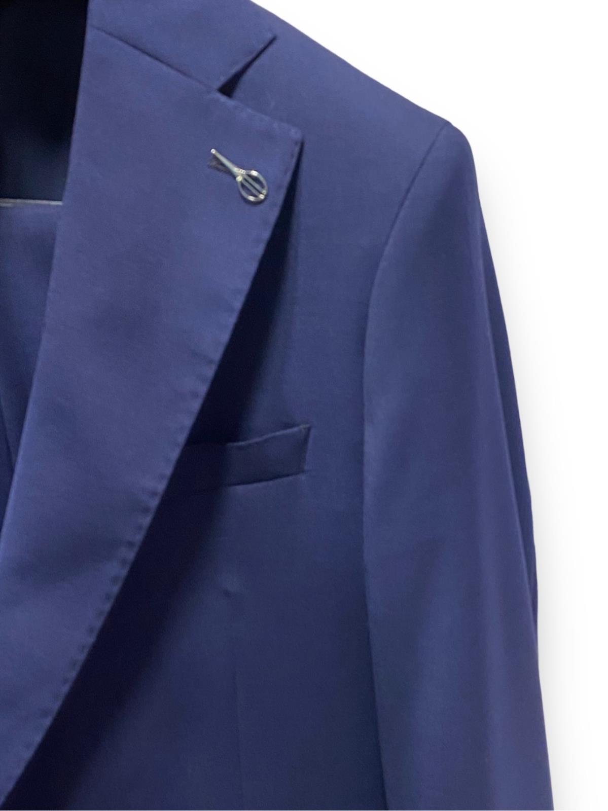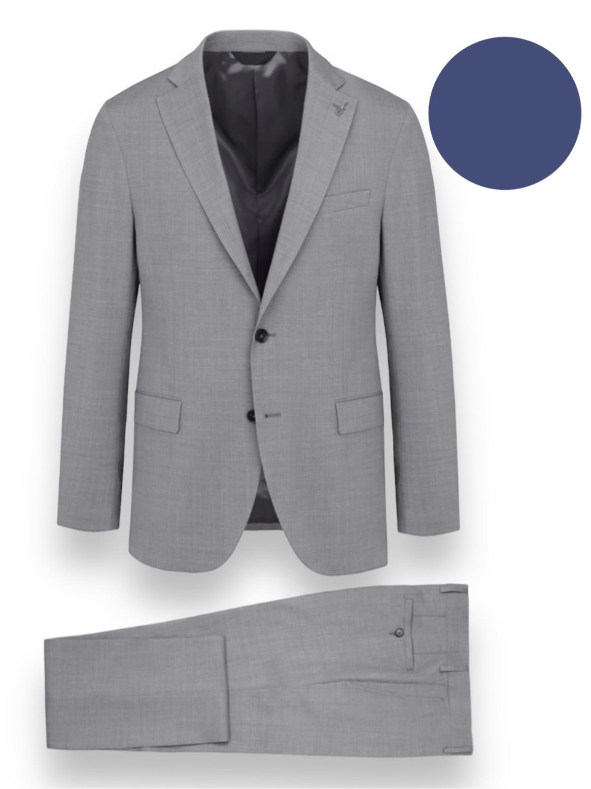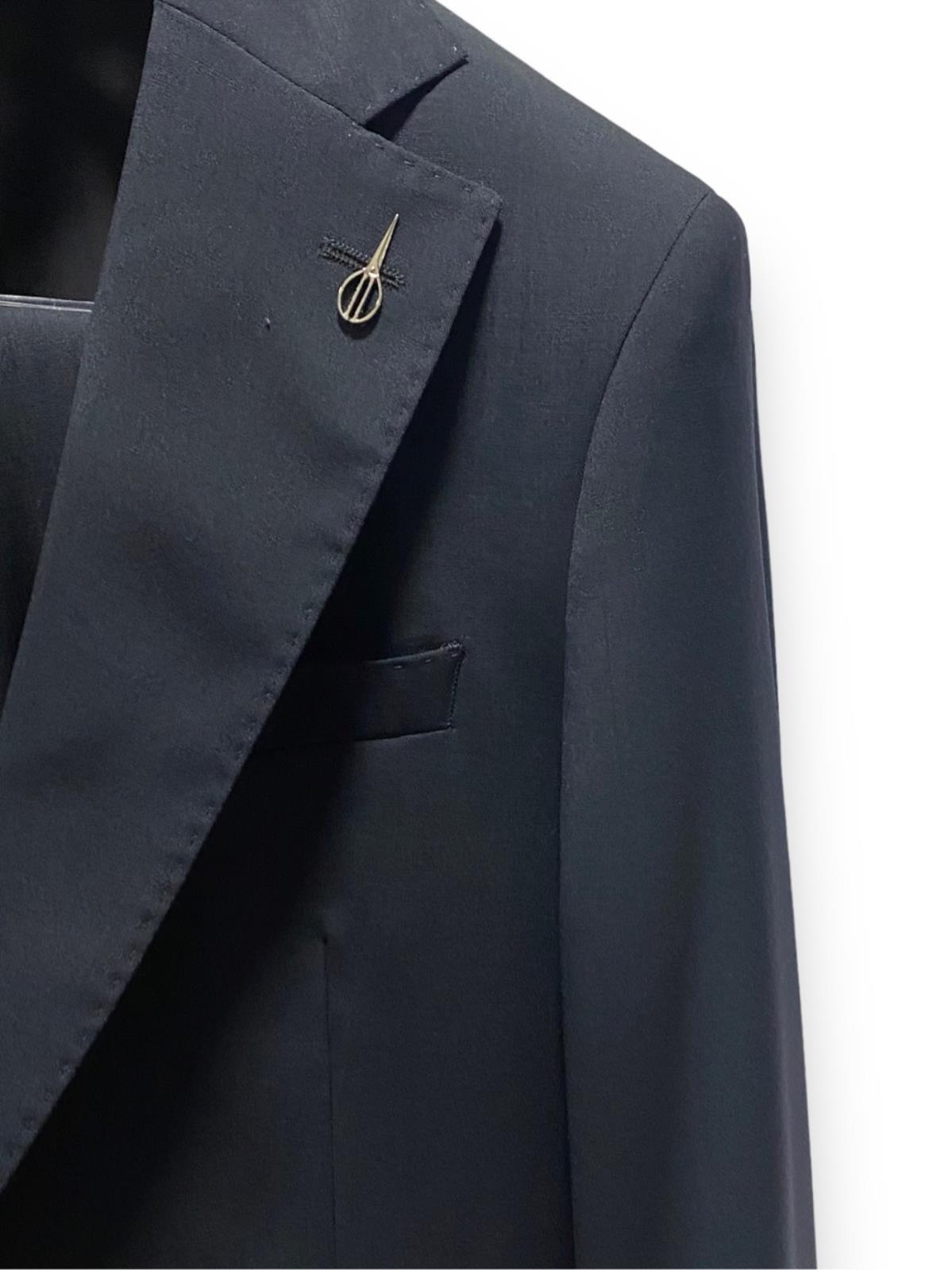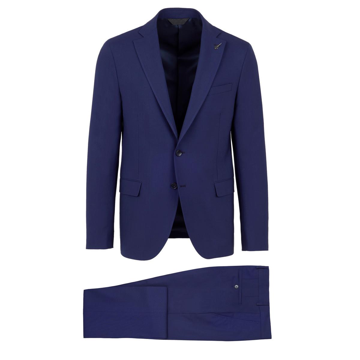 Abito monopetto foderato base "Slim" drop 7. Giacca foderata 2 bottoni, rever cm. 8, tasche con patte, spacchi laterali e taschino a pistagna, quattro bottoni sormontati sul fondo manica. Giacca con rinforzo al petto e spalla "naturale", lunghezza su tg. 50 cm. 73. Pantalone senza pinces, chiusura a zip con gancio e bottone in vita, passanti per cintura, tasche inclinate laterali e ad un filetto posteriori, fondo cm. 18. Tela lana natural stretch B-dynamic